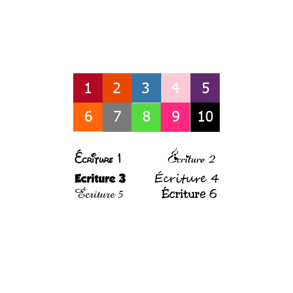 Pour vous aider a choisir votre écriture et coloris merci de vous réferer aux photos.
