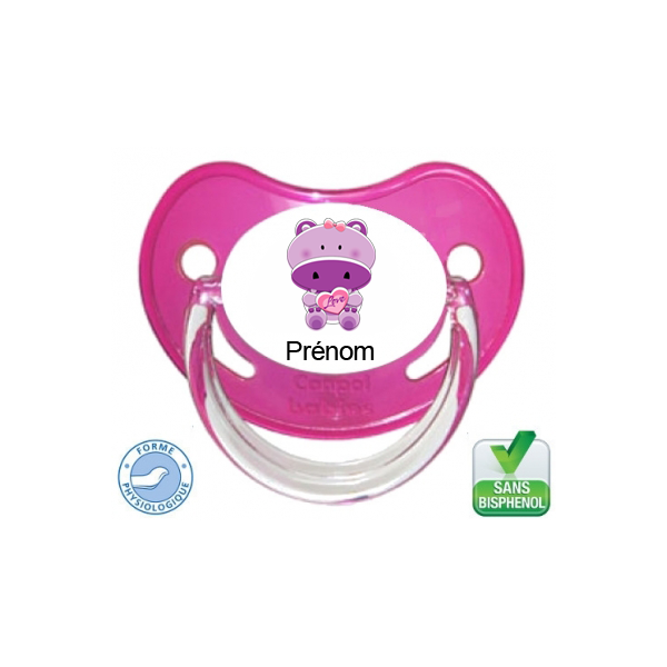 Tétine bébé personnalisée avec un hippopotame et le prénom de bébé